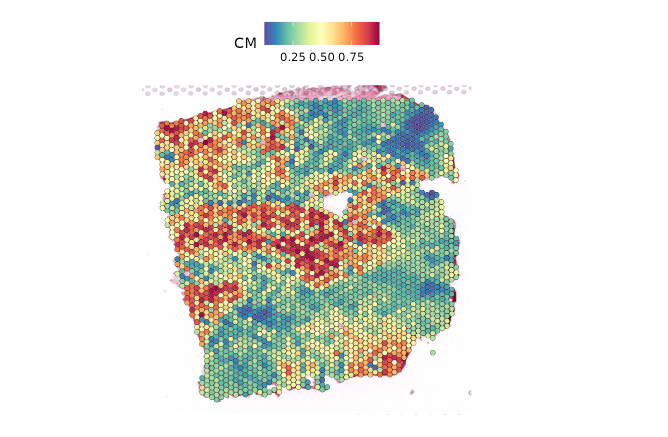 SpatialFeaturePlot(object, features = "CM", keep.scale = NULL,pt.size.factor = 2,alpha = 1)