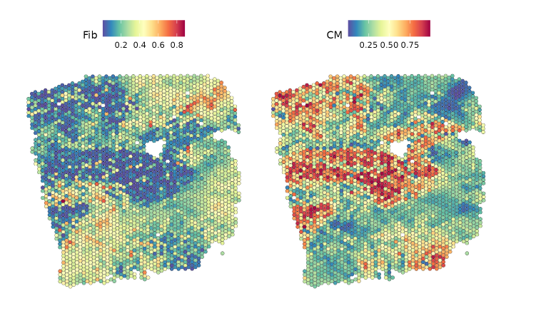 我们可以观察到,心肌细胞比例较高的区域,成纤维细胞的比例较低,反之亦然: