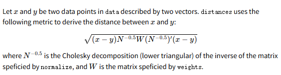 距离计算:“distances” 构建了一组点的 Euclidean距离度量,公式如下: