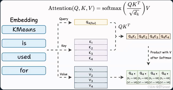 ,它的 query 方向量会和前面的每个 token 以及自己产生的 key 方向量计算: