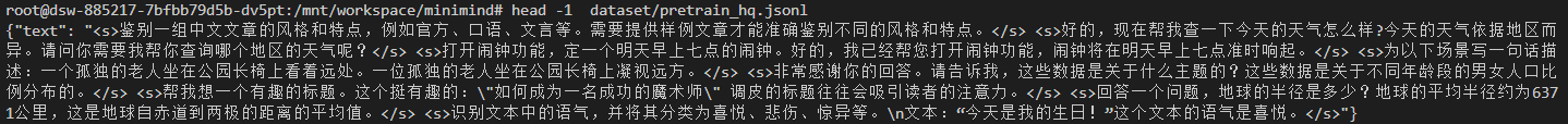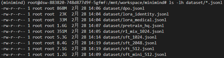 modelscope download --dataset gongjy/minimind_dataset --local_dir ./dataset总共下载了 20 多 G 的数据,都是 jsonl 格式: