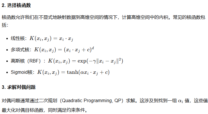 优化问题的对偶形式:通过拉格朗日乘数法将原问题转化为对偶问题,核函数自然融入: