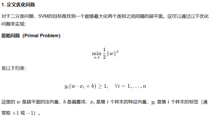 核心思想:SVM的目标是找到一个超平面,使得该平面到最近样本点(支持向量)的距离最大。这种间隔最大化策略旨在提高模型的鲁棒性,减少过拟合风险。